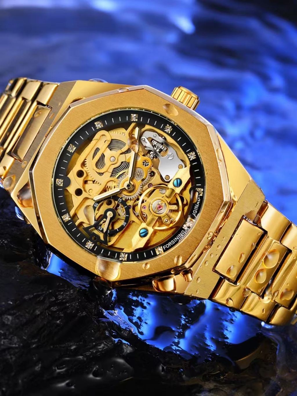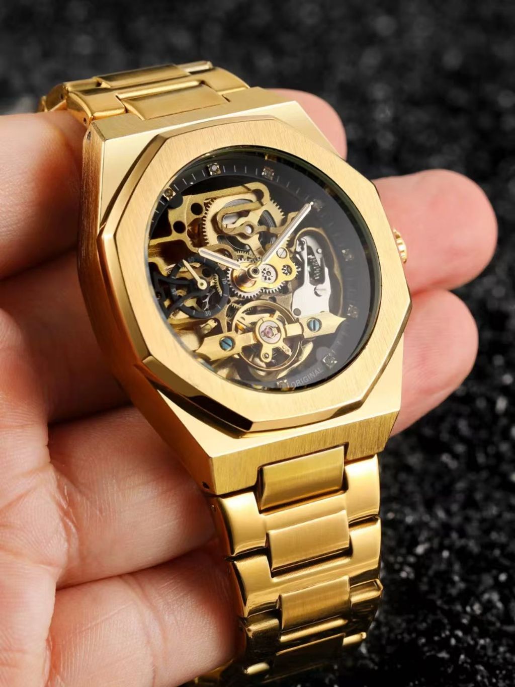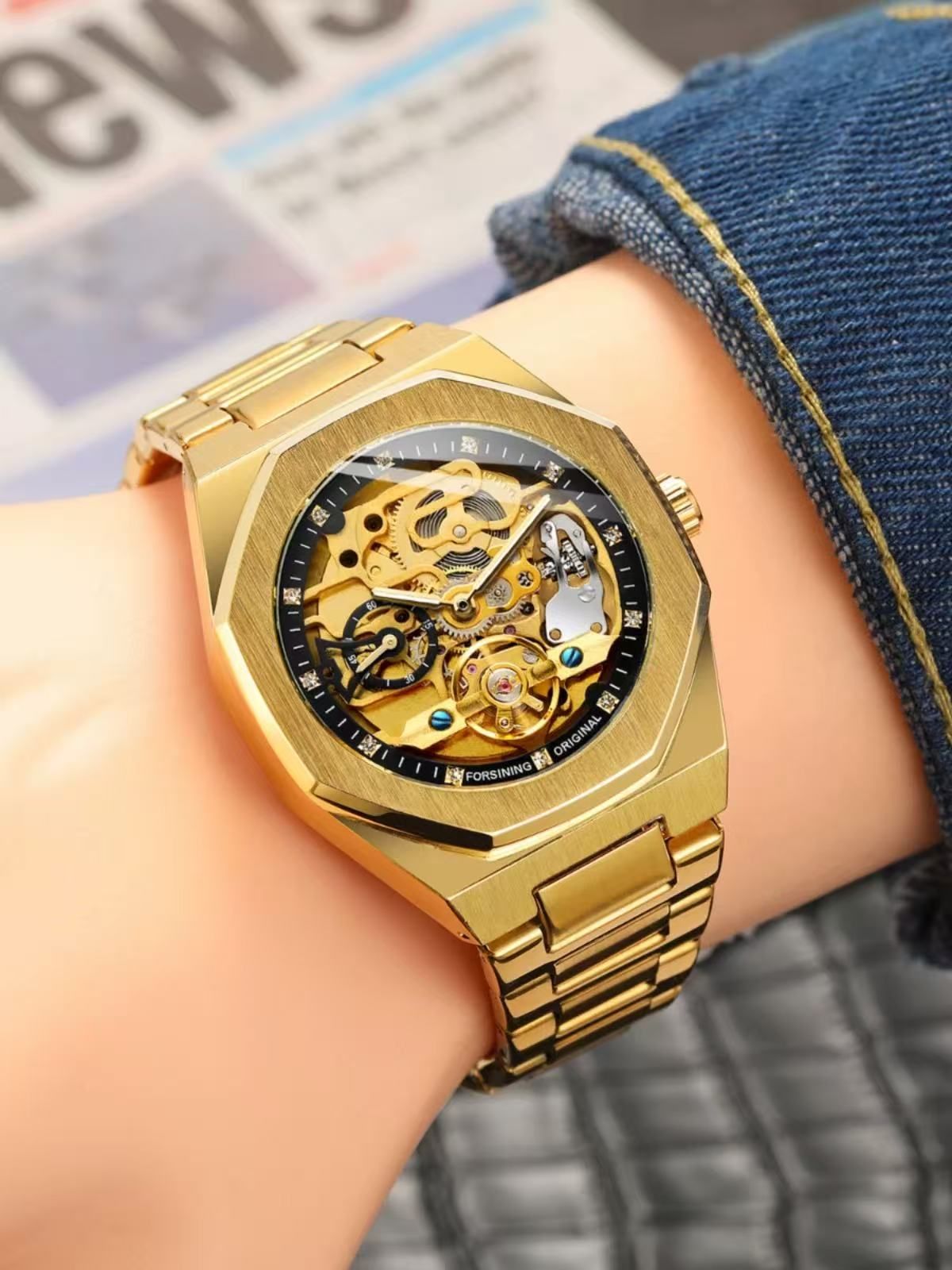 Relógio mecânico automático dourado para uso empresarial, com caixa poligonal